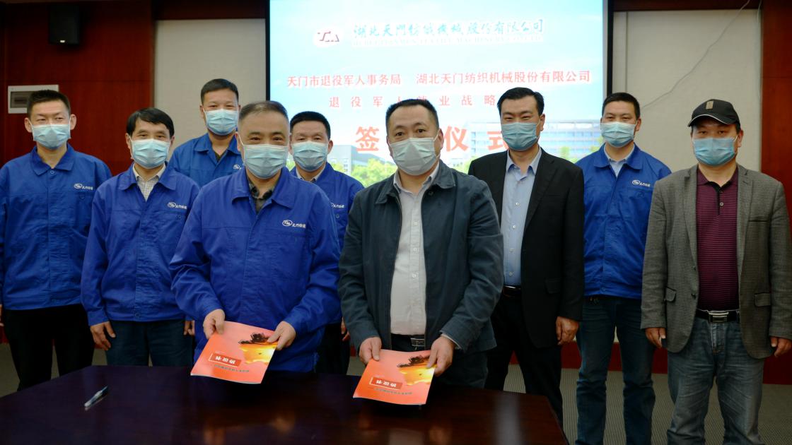 4月23日下午,天門市退役軍人事務局與天門紡機舉行退役軍人就業戰略合作簽約儀式,天門市退役軍人事務局副局長李文超、天門紡機總經理焦倫進分別代表雙方簽約。
