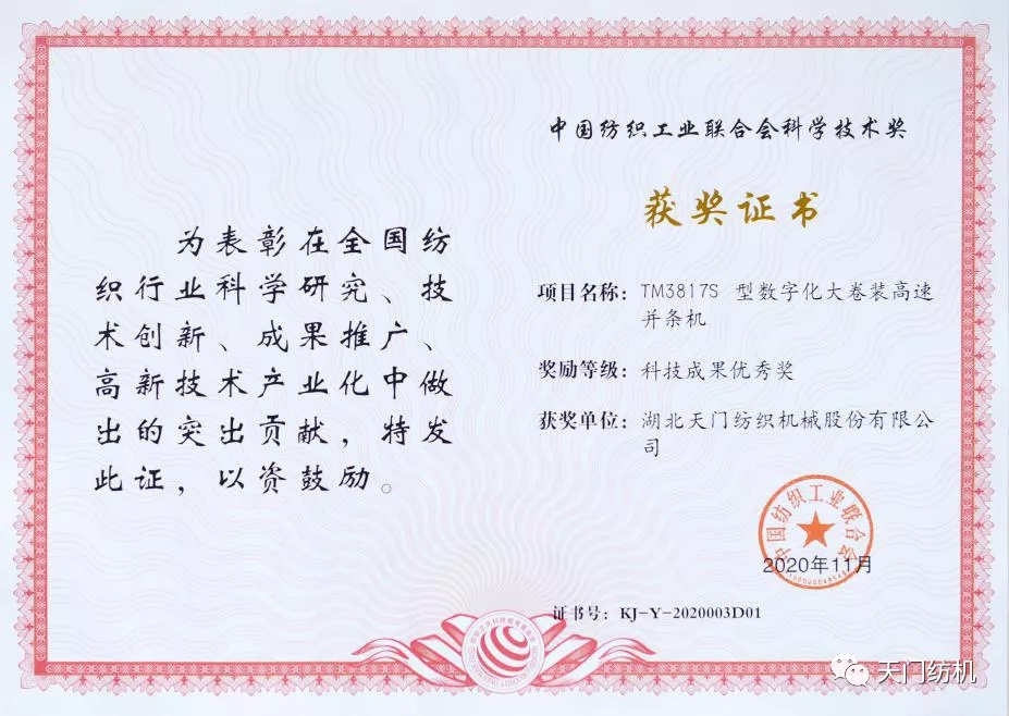 近日,中國紡織工業聯合會發布2020年度科技成果優秀獎獲獎通知,并頒發證書,天門紡機TM3817S型并條機獲評“紡織之光”2020年度中國紡織工業聯合會“科技成果優秀獎”。鄭強、楊家軒、黃必廣、郭升旗、徐紅、譚鵬飛、沈忱等7名研發人員獲得個人“科技成果優秀獎”