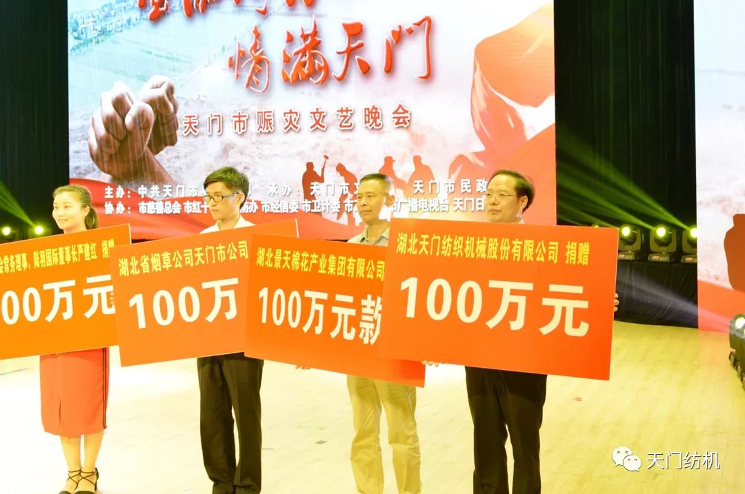 2016年,天門全市遭遇百年一遇的特大洪澇災(zāi)害,人民生命財(cái)產(chǎn)受到嚴(yán)重威脅。天門紡機(jī)積極參與政府組織的抗洪救災(zāi)慰問(wèn)活動(dòng),為奮戰(zhàn)在一線的防汛抗災(zāi)人員送去食品、藥品和救災(zāi)物資,并捐贈(zèng)100萬(wàn)元抗洪救災(zāi)款。