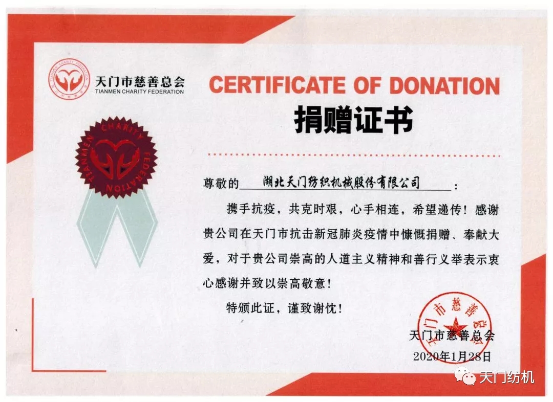 2020年,面對(duì)來(lái)勢(shì)洶洶的新冠疫情,作為一家民營(yíng)企業(yè),天門紡機(jī)不計(jì)經(jīng)濟(jì)損失,率先提出了“不給黨和政府添麻煩,不給疫情防控添壓力,不給社會(huì)就業(yè)添負(fù)擔(dān)”,率先停產(chǎn)歇業(yè),率先捐贈(zèng)100萬(wàn)元,專門用于收治新冠患者,采購(gòu)短缺醫(yī)療物資。公司管理層還通過(guò)多種渠道,主動(dòng)與有影響力基金會(huì)取得聯(lián)絡(luò),分6個(gè)批次向醫(yī)院、社區(qū)捐贈(zèng)了30萬(wàn)只醫(yī)用口罩、10噸醫(yī)用消毒液、2萬(wàn)件防護(hù)服等大量物資,在抗疫的危急時(shí)刻發(fā)揮了重要作用。