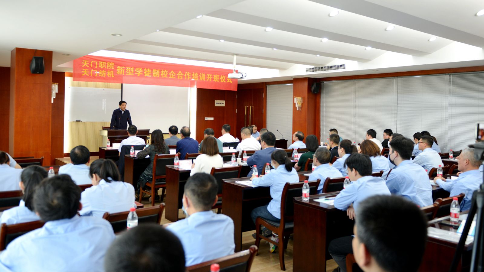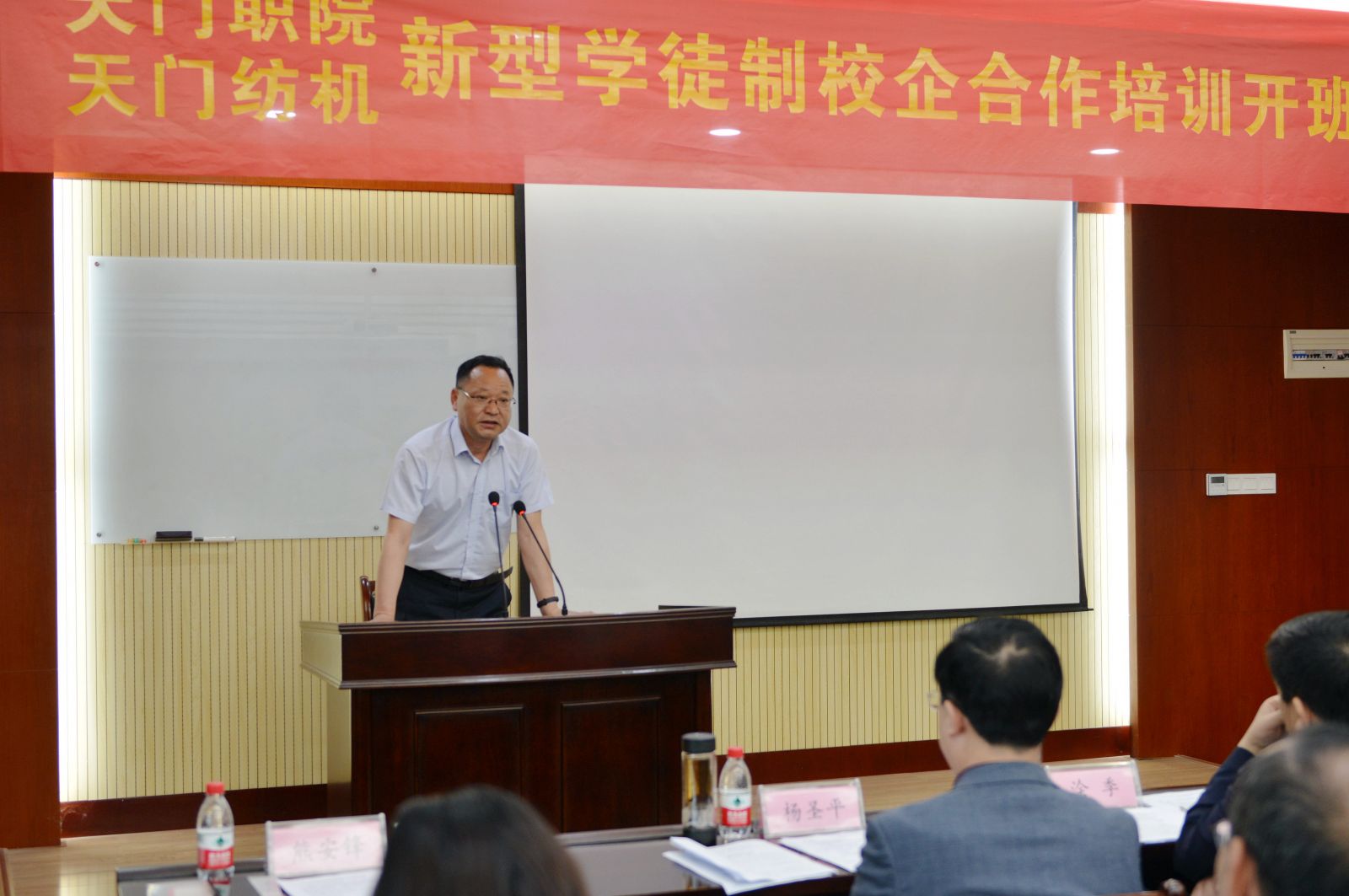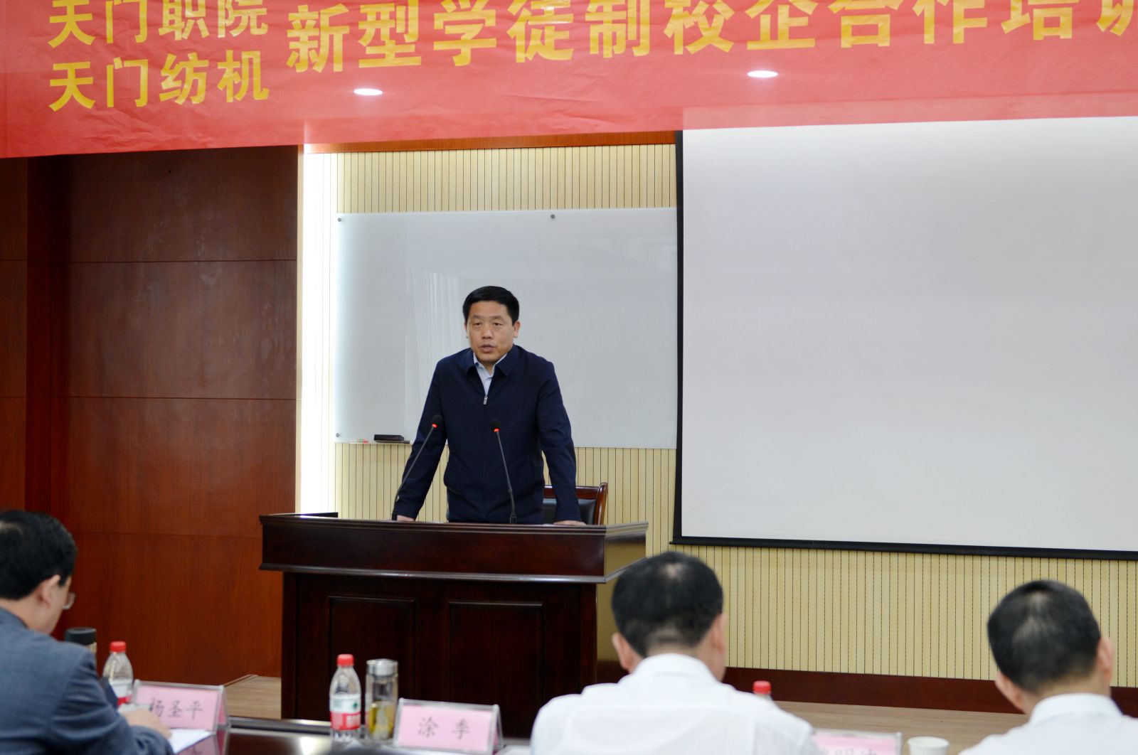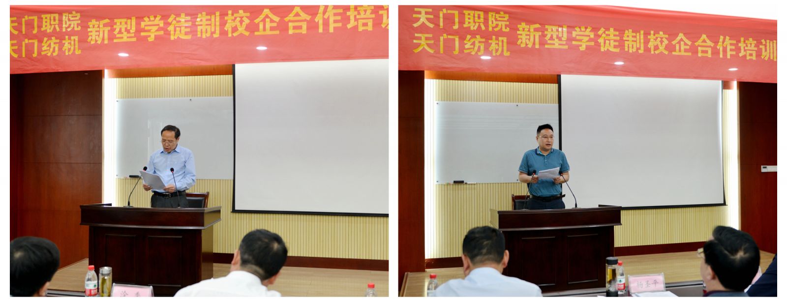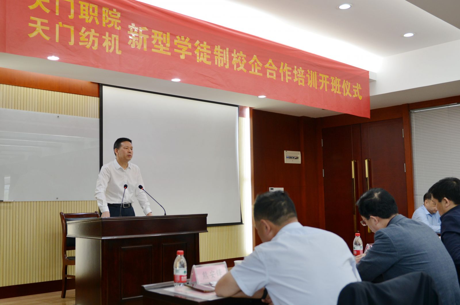 天門紡機黨委書記魯德文介紹了《天門職院與天門紡機新型學徒制培訓方案》,天門職業學院教師何漢兵作了發言,他代表全體培訓教師表態,一定不負期望,精心備課,靈活施教,圓滿完成教學任務。