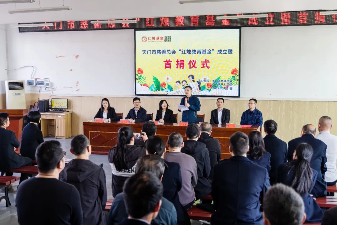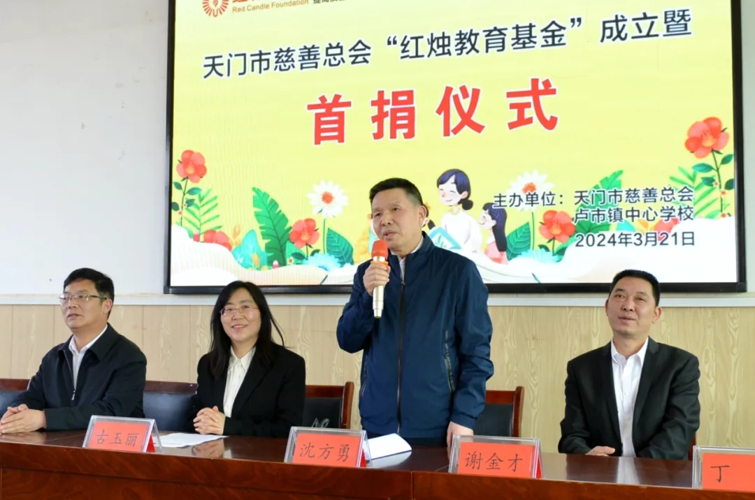 2024年3月21日,天門紡機董事長沈方勇出席在天門市盧市鎮盧家口中學舉行的天門慈善總會“紅燭教育基金”成立暨首捐儀式,同天門市慈善總會、教育局三方簽訂了《天門市慈善總會“紅燭教育基金”協議書》,并現場捐贈100萬元,用于獎勵盧市鎮優秀教師和幫扶困難教師等公益活動,助力盧市鎮教育高質量發展。天門市人民政府副市長古玉麗,天門市民政局局長、市慈善總會會長謝金才,天門市教育局局長劉華陽,天門市慈善總會秘書長李貴清,盧市鎮宣傳統戰委員劉恒超以及盧市鎮部分教師代表等參加首捐儀式。盧市鎮黨委書記趙君波主持儀式。