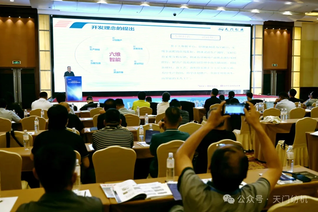 在技術交流環節中,天門紡機品控總監樊早斌作了題為《六維智能開創并條產線聯動新時代》的主旨報告。他深入闡述了產線聯動的理念、研發背景和思路,詳實介紹了基于六維智能的并條創新技術以及產線聯動的實踐應用與開發進程。他強調,“六維智能”開發理念的提出是基于大數據平臺,其創新點就是以智能制造為突破口,實現全流程的在線監控、快速靈活生產調度、實時信息采集分析反饋,快速有效地對產品狀態進行實時跟蹤,解決產品追溯控制管理中的關鍵問題;利用新材料、新工藝、新科技實現上下工序互聯互通,有序生產協同,科學計劃排產,全面實現低成本、高智能的無人工廠。