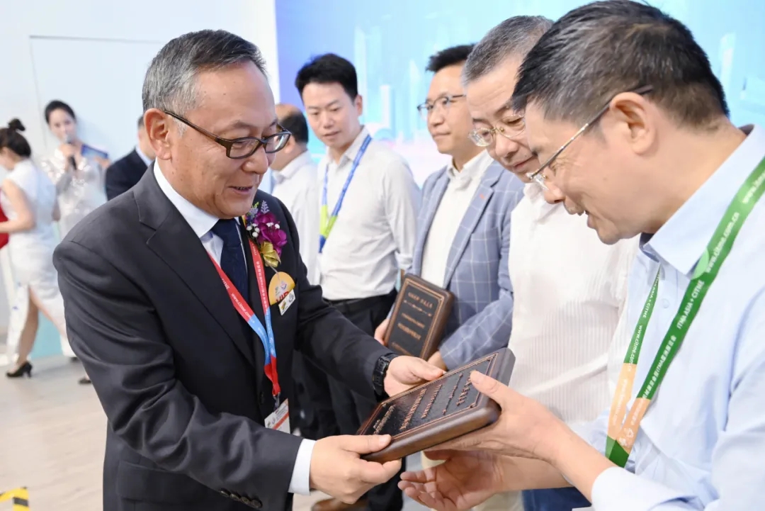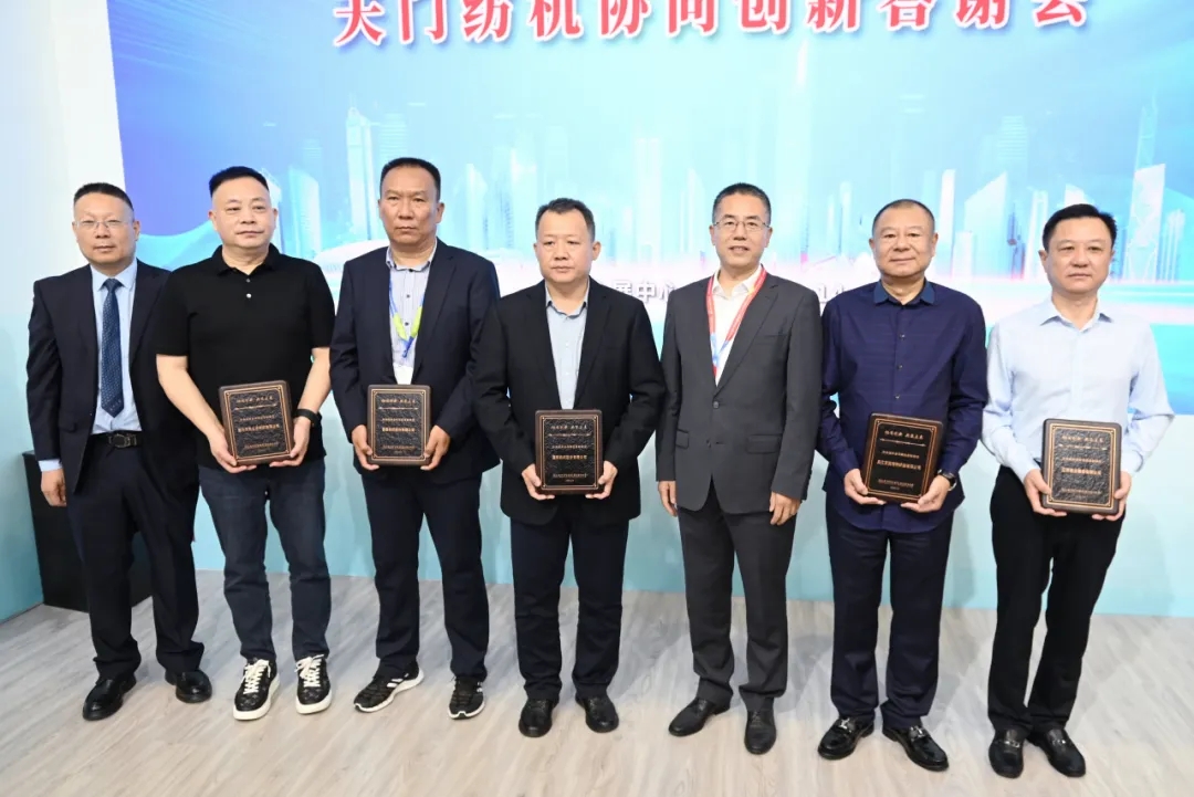 天門紡機總經理焦倫進宣布在協同創新中作出突出貢獻的單位和個人名單,中國紡織工業聯合會徐迎新副會長為倪俊龍董事長、陳冰教授、曹中華博士、陸惠文先生頒發紀念章,為臺達、匯川、南通五洲等3家企業代表頒發紀念牌。