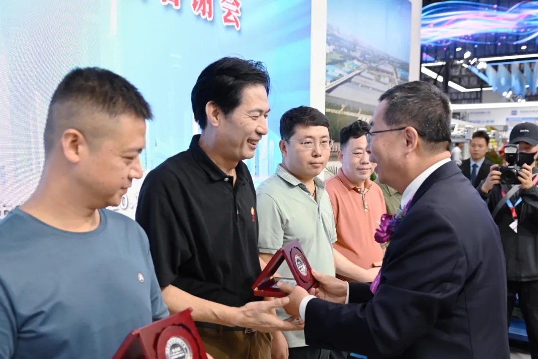 天門紡機副總經理肖少華宣布為在并條新技術、新產品示范應用上作出突出貢獻的華茂集團、魏橋紡織、魯泰紡織等45家企業名單,中國棉紡織行業協會董奎勇會長為這些企業代表頒發紀念牌。