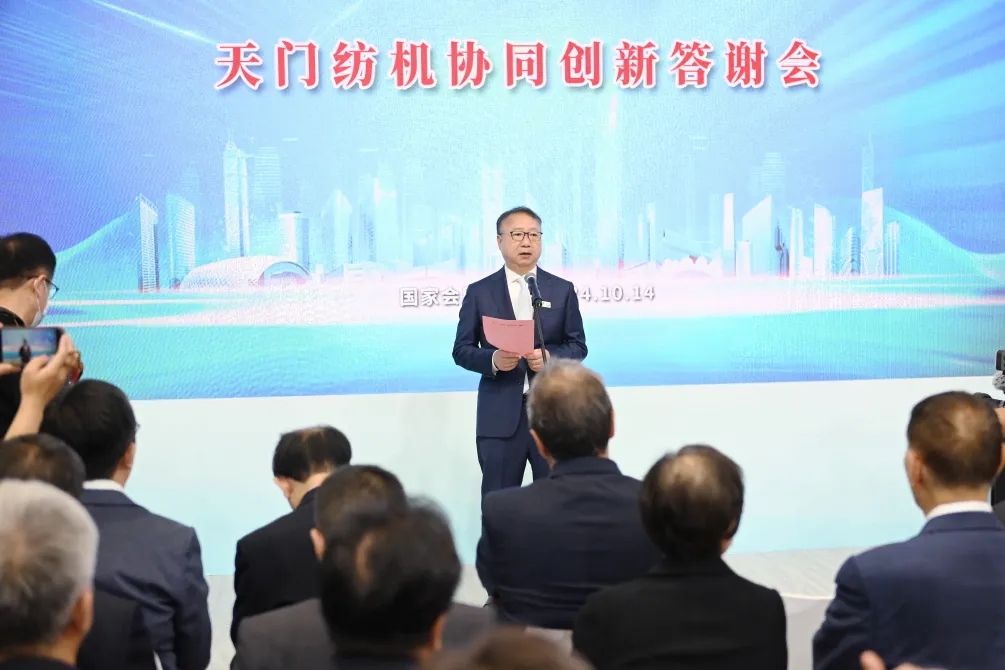 中國紡織工業聯合會會長孫瑞哲作了重要講話。他首先代表中國紡織工業聯合會對活動的舉辦表示熱烈祝賀!向為天門紡機并條技術進步作出貢獻的功臣們致以崇高敬意!他在給予天門紡機“是當之無愧的棉紡并條專家”的充分肯定與最高贊譽時強調:作為紡機行業的中堅力量,天門紡機扎根本土、布局全球、銳意創新、深耕專業,在推動民族紡機品牌自立自強中貢獻卓著。天門紡機的每一次成功與飛躍,是企業自身追求卓越、勇攀高峰的回報,也是產業生態高效協同、價值共創的成果。他希望:在新征程上,天門紡機及其合作伙伴繼往開來、攜手共進、一以貫之推進紡機行業行穩致遠,助力中國紡織行業新質生產力發展。