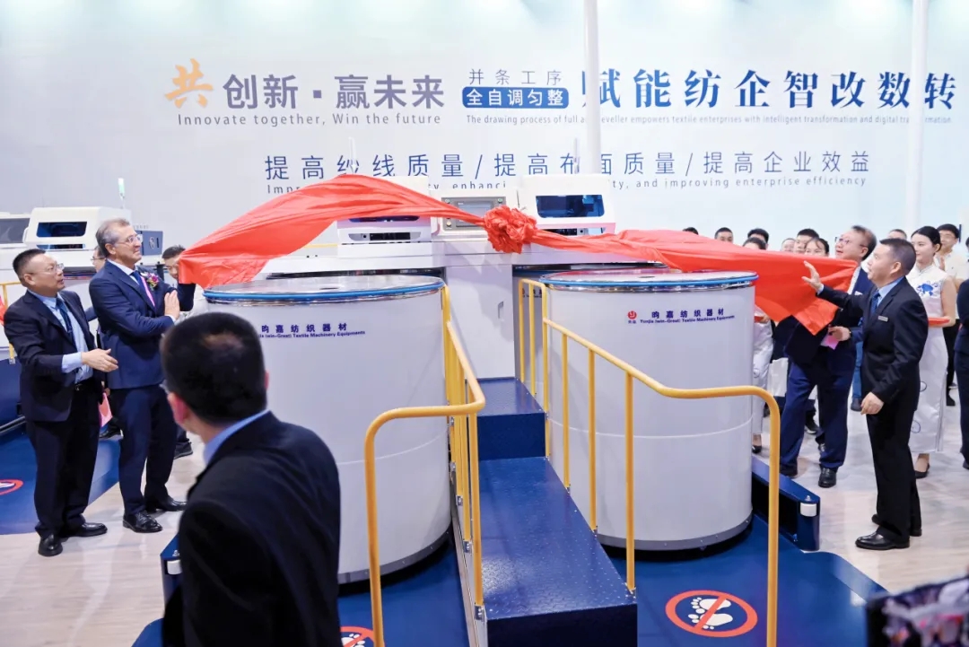 答謝會結束后,隨即舉行了新產品揭幕、開機儀式。天門紡機今年展出了TM23、TM27H、TM29H、TM35等四款型號的并條機。中國紡織工業聯合會孫瑞哲會長等行業領導、嘉賓一起為新產品揭幕,孫會長為展機啟動開機。