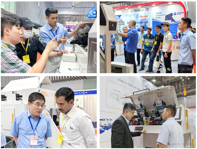 越南展會現場人流如織,其中天門紡機展區尤為矚目,開展期間分別迎來HANO SIMEX、VICOTEX、HONG LINH、NHA TRANG、THANG CONG、PHU BAI等50余家越南紡企的到訪,T1系列并條機憑借卓越性能表現,引發現場觀眾駐足,多位老客戶對T1系列并條機的穩定性與高效產能給予高度評價。